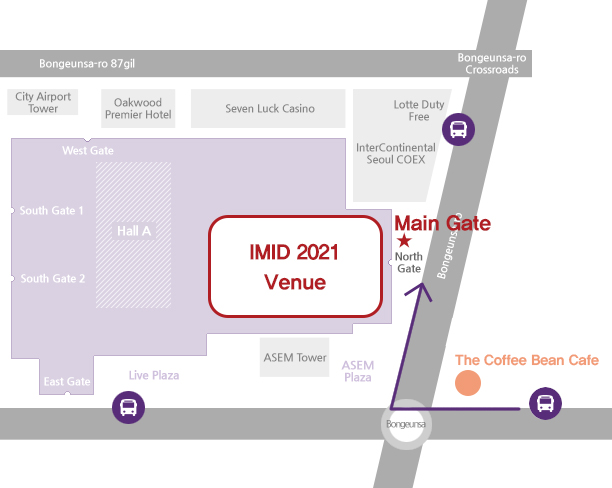 Taking Line #9 at B1 floor of domestic Flights is the best way to get to conference venue from Gimpo International Airport. Take the express train and it will take only 40 minutes to "Bongunsa" station which is close to the venue. When you arrive at the station, go out to Exit #7 and keep straight ahead then you can find the north gate of COEX which is the main entrance for IMID 2020.